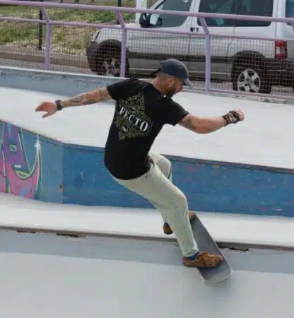 Me llamo Jorge, pero casi todo el mundo me conoce de manera cercana por “coco”, soy de tenerife, tengo 38 años y patino hace casi 30 años. He tenido muchos trabajos, pero he tenido la suerte de mayormente dedicarme a mis dos grandes pasiones, que son el arte y el skate … con el inconveniente de que he tenido muy mala suerte con las lesiones. Actualmente me dedico exclusivamente a dar clases de skate en la escuela municipal de mi ciudad (La laguna TENERIFE) que creamos en 2007, siendo la primera escuela municipal de las islas y actualmente estamos a tope y muy contentos con el trabajo realizado durante todos estos años @lapuntaskatepark (La laguna) @deporteslalaguna @idaira_afonso84