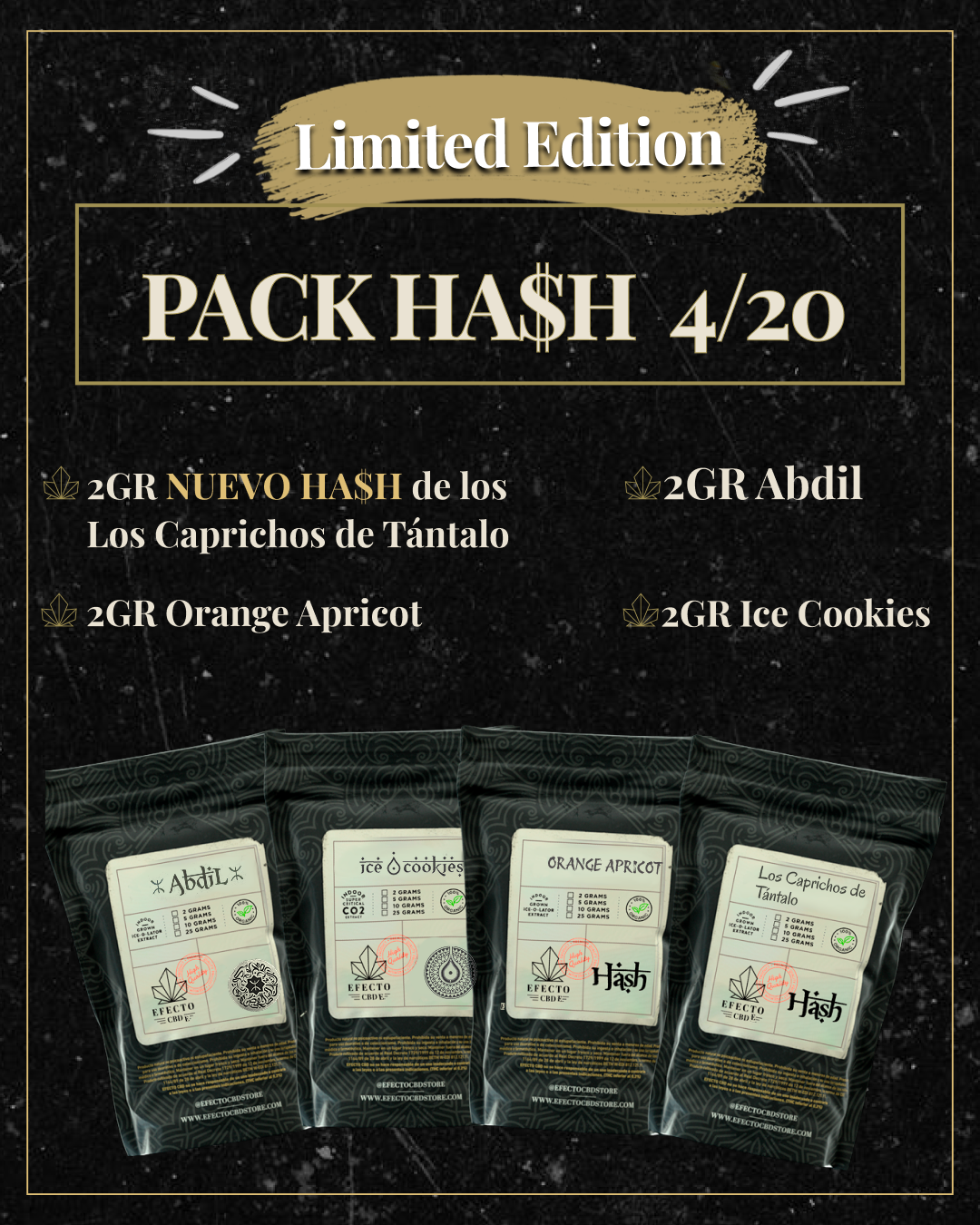 El Hash Pack 4/20 es una selección especial de extracciones pensada para quienes buscan variedad en un formato compacto. Incluye diferentes tipos de hash cuidadosamente elegidos, combinando novedades y referencias destacadas dentro de la gama.